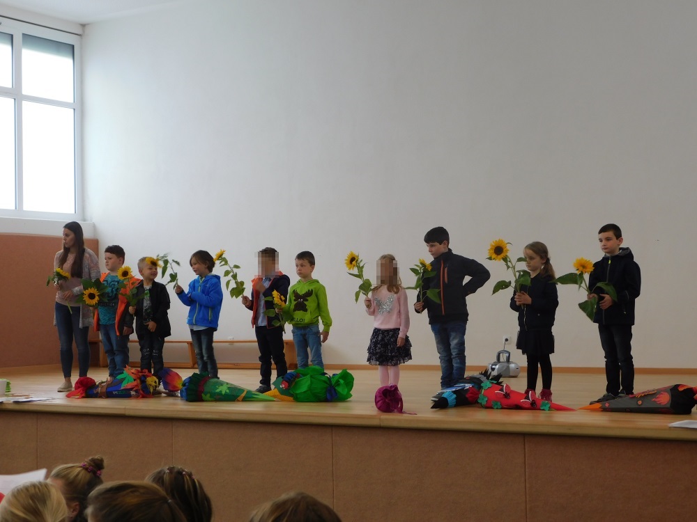 Anschließend stellten unsere Zweitklässler auf der Bühne heitere Anekdoten aus dem Schulleben in Gedichtform vor. Im Anschluss daran durften die Erstklässler selbst die Bühne betreten. Jedes Kind wurde von Frau Groh-Eberle vorgestellt und erhielt eine Sonnenblume. Frau Schroll, die Klassenlehrerin, gesellte sich zu ihren neuen Schützlingen und dieses bunte Bild ließen sich die Eltern nicht entgehen. Nun knipsten die Kameras unaufhörlich, um einen möglichst schönen Schnappschuss zu ergattern.