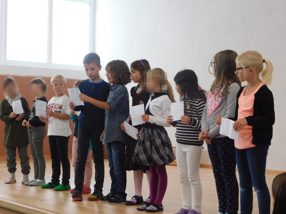 Dass der erste Schultag etwas ganz Besonderes ist, spürten unsere neun Schulanfänger am Dienstag, den 12. September 2017. Aufgeregt und voller Neugier auf das Neue betraten sie zusammen mit ihren Eltern und Verwandten die Turnhalle. Dort wurden sie bereits von den Kindern der 2., 3. und 4. Klasse erwartet. Da sie sich mit ihren großen Schultüten auf die vordersten Bänke setzen sollten, merkten sie recht schnell, dass sie heute im Mittelpunkt standen und die Ehrengäste waren.